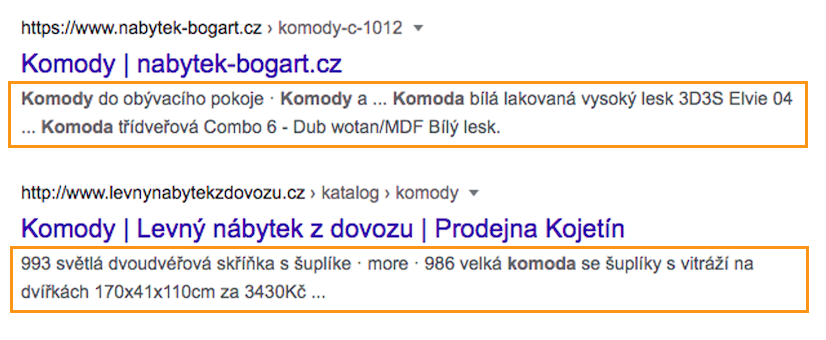 Pokud je meta description u dané stránky smysluplně vyplněný, vyhledávače jej mohou zobrazit ve výsledcích vyhledávání jako lákavé sdělení. Může však nastat situace, kdy popisek na stránce nevyplníte. V tom případě Googlebot dosadí text podle svého uvážení (toto se pravděpodobně stane i v případě, pokud máte vyplněný meta popis, ale roboti ho vyhodnotí jako nevhodný). U vyhledávače Seznam je to trošku jinak. Ne vždy se Seznam snaží najít vhodnou alternativu k meta popisku.