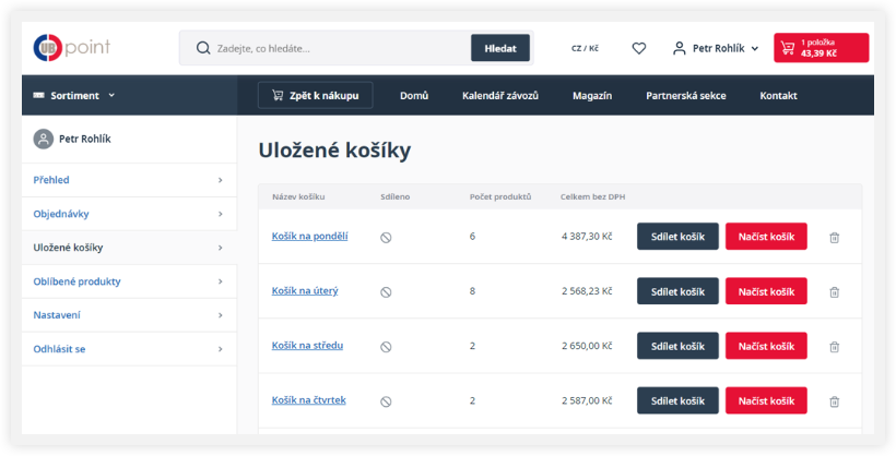 Uložený košík umožňuje velkoobchodním zákazníkům uložit si obsah nákupního košíku pro pozdější objednání nebo případné znovupoužití.