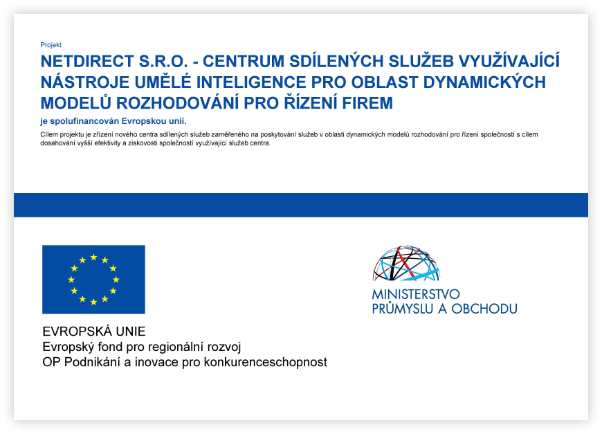 Projekt „NetDirect s.r.o. - Centrum sdílených služeb využívající nástroje umělé inteligence pro oblast dynamických modelů rozhodování pro řízení firem“ reg. č. CZ.01.4.04/0.0/0.0/18_232/0018020 je spolufinancován Evropou unií. Cílem projektu je zřízení nového centra sdílených služeb.