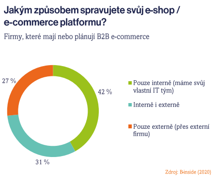 Když firma dojde do bodu, kdy se rozhodne e-commerce platformu přijmout, následuje řešení další důležité věci: správy platformy. Podle průzkumu si 42 % dotázaných firem spravuje svou platformu výhradně interně. Externí společnosti by správu svěřilo