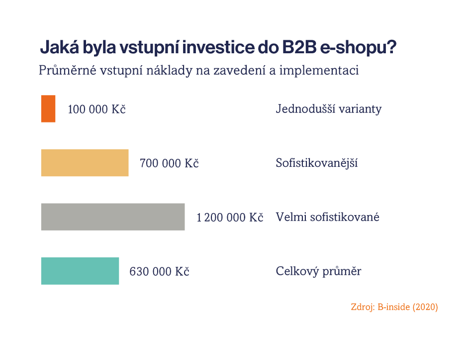 Vstupní náklady za B2B e-shop (B2B portál) jsou podobné, spíše nižší ve srovnání s náklady na zřizování nové prodejny či provozovny. Obecně se ale dá říct, že cena B2B e-shopu se pohybuje v řádech vyšších statisíců až nižších milionů korun – vše